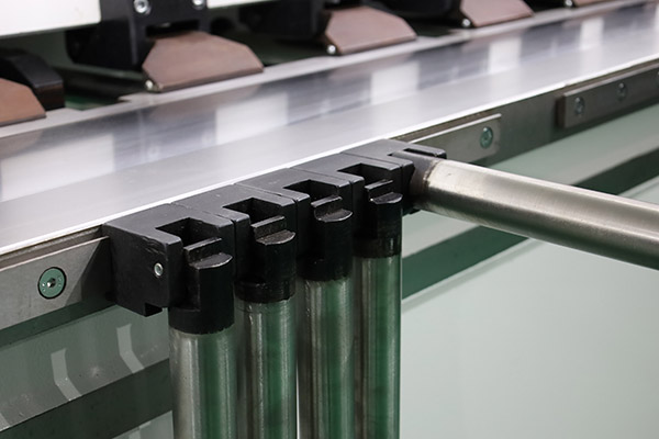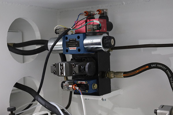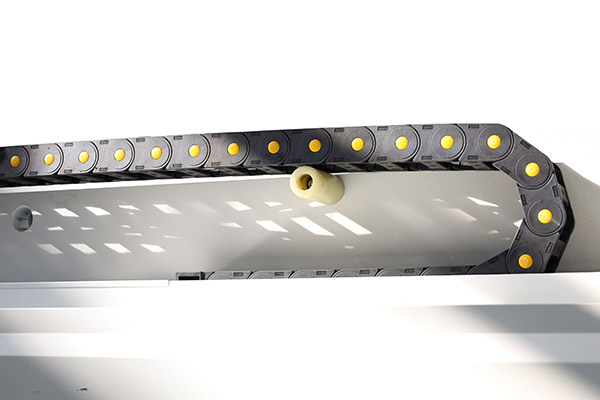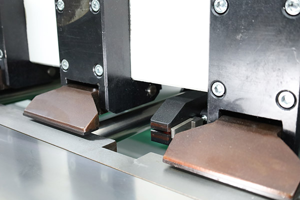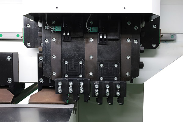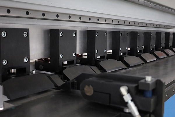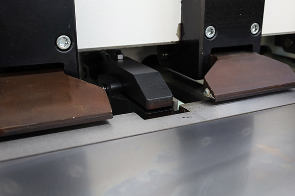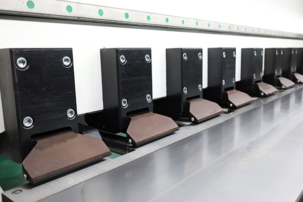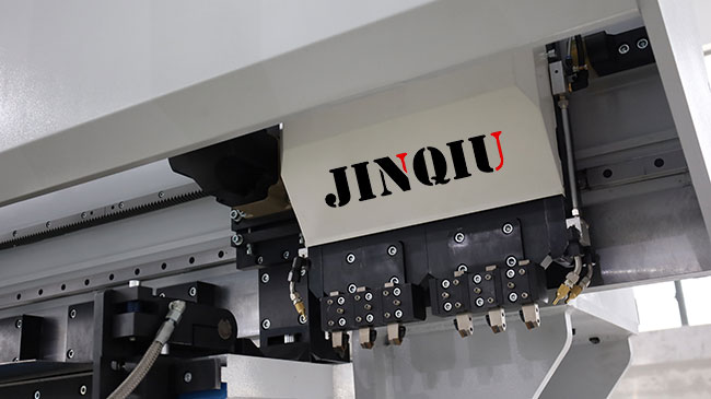 The Jinqiu vertical reciprocating grooving machine features a worktable made of carbon tool steel. After high-frequency quenching, its hardness reaches 55–60 HRC, significantly higher than that of stainless steel, effectively preventing scratches and deformation. The table ensures flatness within ≤±0.03 mm, improving V-groove accuracy and extending equipment service life. It is equipped with densely arranged press feet and a hydraulic system, providing stable and reliable clamping force.