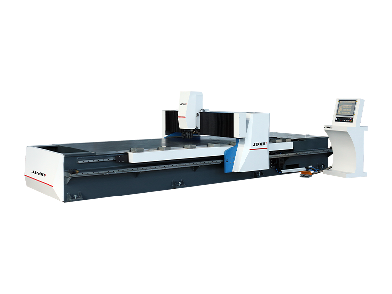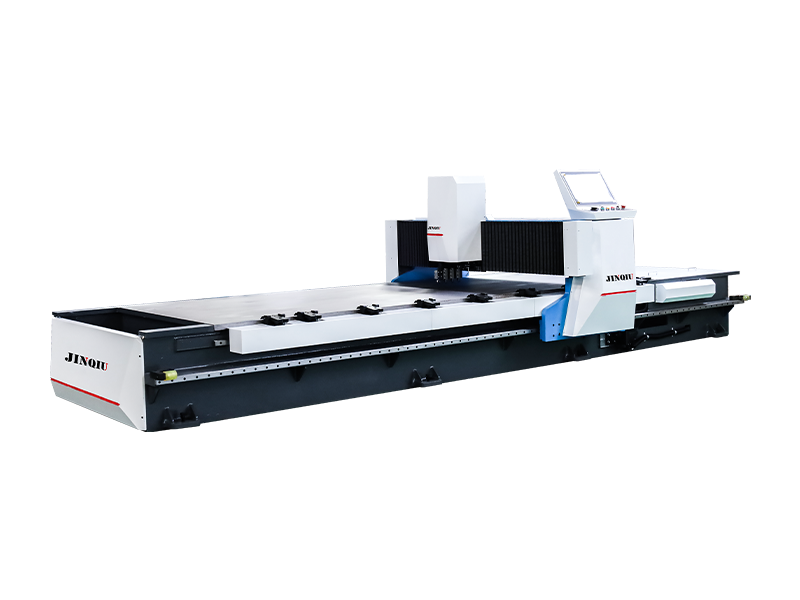 The Jinqiu Fully Automatic Four-Side Grooving Machine is based on a horizontal gantry frame, and the machine base and crossbeam are tempered by an electric furnace to eliminate welding stress, ensuring high rigidity and stability of the machine tool; The overall rack undergoes CNC precision machining for one-time clamping, ensuring that the installation surface is parallel and perpendicular; The low-alloy high-strength steel tabletop is processed by self planing to be flat and smooth. During processing, the plate remains stationary to avoid wear and tear, making it particularly suitable for precision processing of decorative and mirror surface plates.